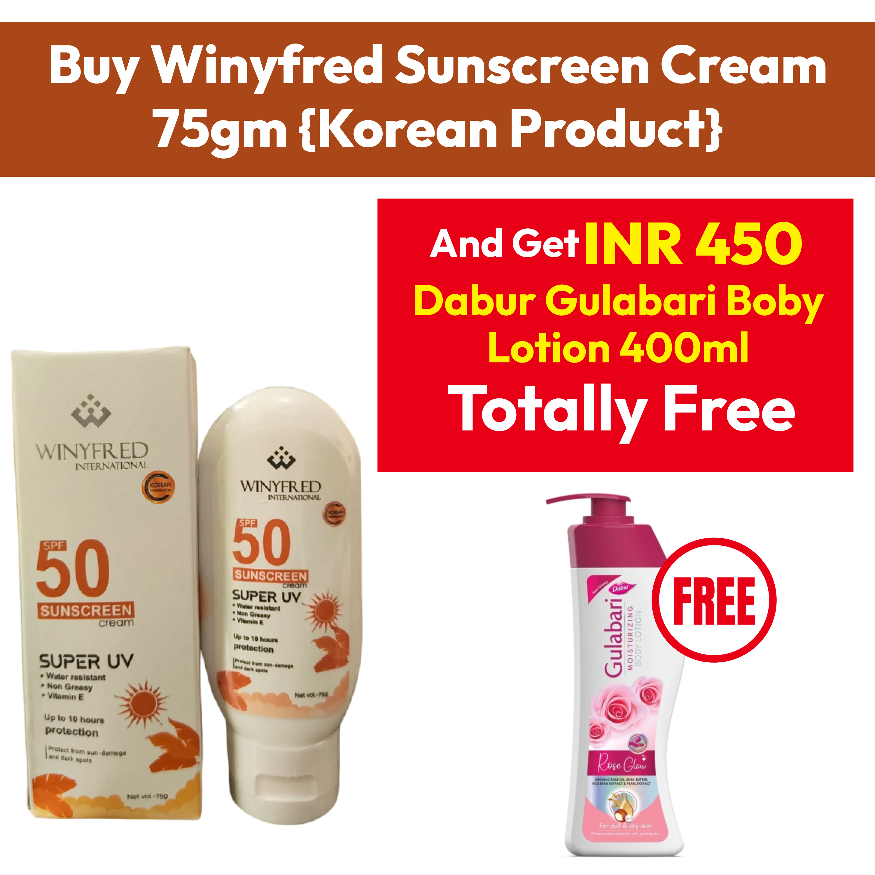 Winyfred Sunscreen Cream 75gm {Korean Product} + Dabur Gulabari Boby Lotion 400ml Free